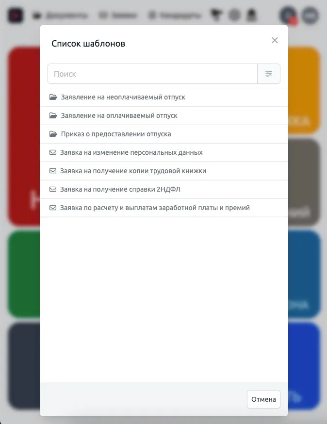 Электронная система Коман поддерживает любые шаблоны кадровых заявлений. Организация сама решает, какие шаблоны сделать доступными для сотрудников, но чаще всего в Коман подают следующие заявления: