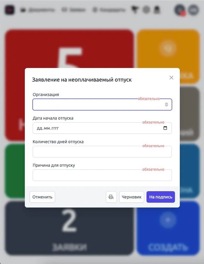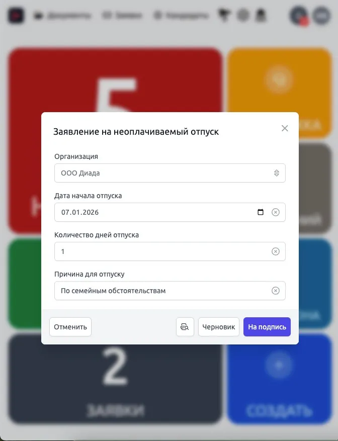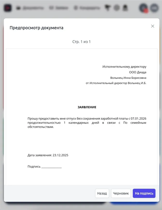 🔹Отправить на подпись. Когда все поля заполнены, нажмите кнопку «На подпись». Система попросит вас подтвердить действие – по сути, это и есть наложение вашей электронной подписи. После подтверждения заявление будет считаться подписанным вами и отправится адресату для дальнейшего согласования и подписания.